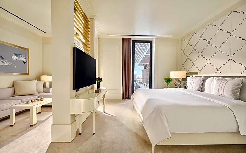 This Suite comes with One King and Two Queen size beds, a large living space area, a balcony, and stunning views over the town square.